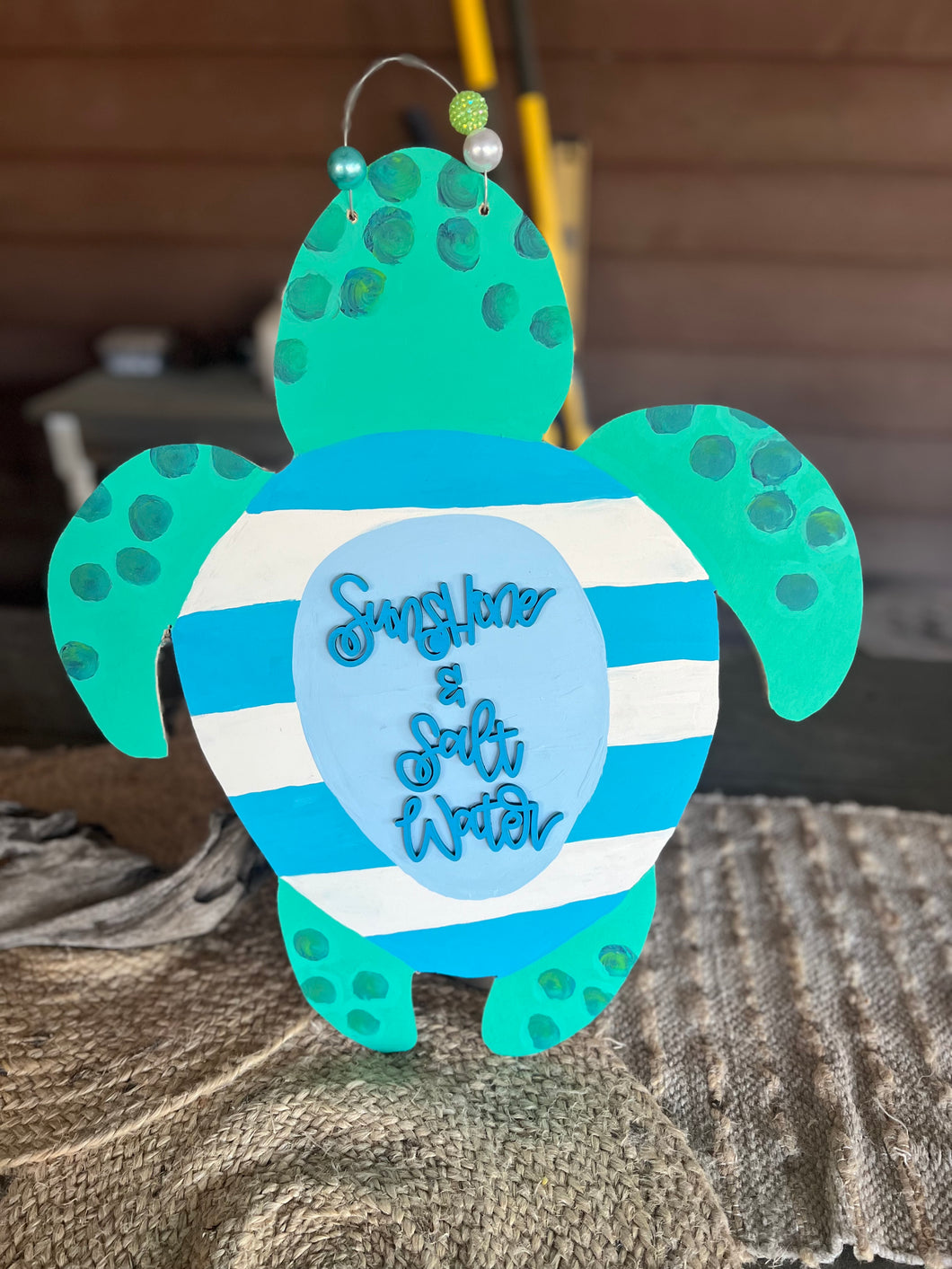 The turtle features beautiful hand-painted stripes in layered shades of blues and greens, capturing the movement and magic of the ocean. Across his shell, the phrase āSunshine & Saltwaterā adds the perfect coastal sentiment for beach lovers, OBX locals, and anyone who feels at home by the sea.