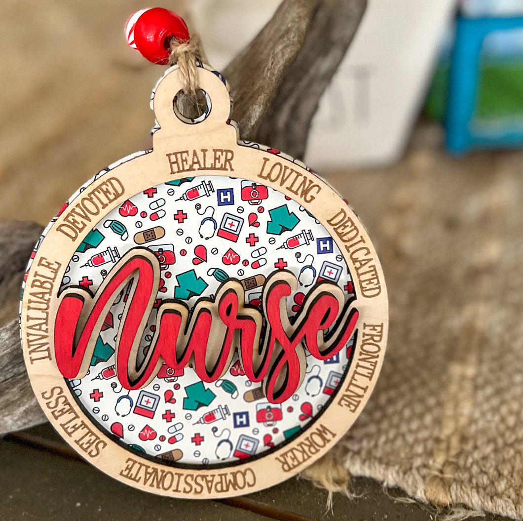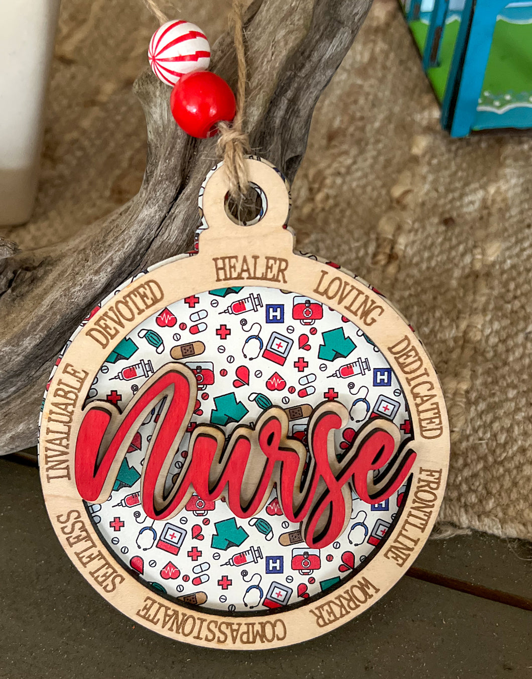 Handcrafted Nurse Ornament – Layered Wood Christmas Ornament with Engraved Words