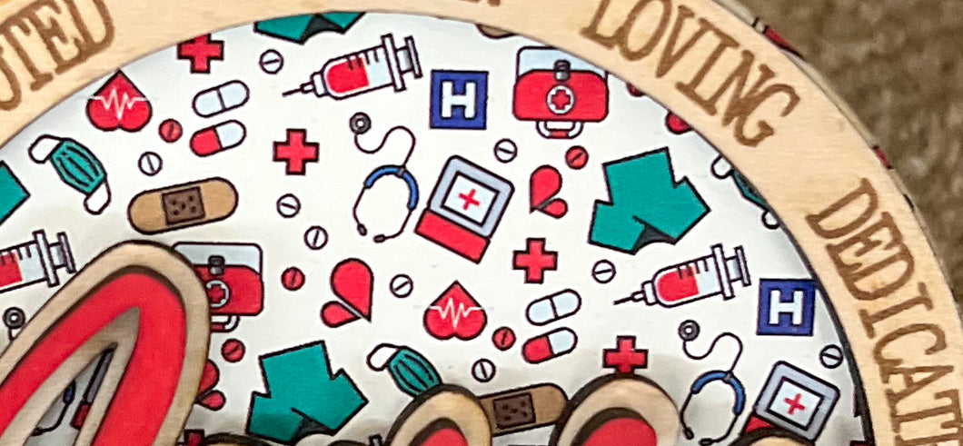 The middle layer forms a circular wooden frame engraved with words that define what it means to be a nurse — selfless, frontline, dedicated, compassionate, and more.