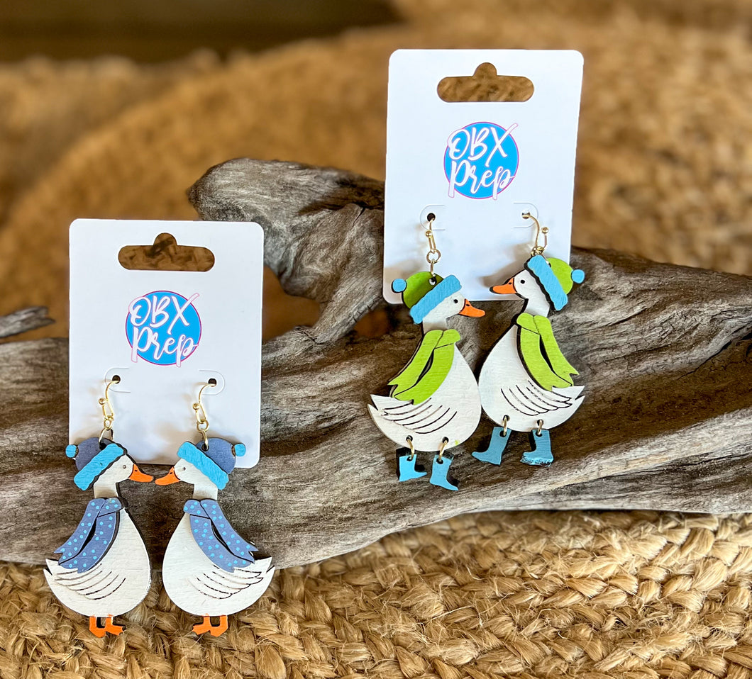 Made from Baltic birch wood, each pair features our silly goose friends dressed for the season — bundled up in cozy scarves and winter caps, with the sweetest touch of shimmer in their winter wear. One goose even sports tiny dangling boots, adding playful movement and extra personality with every step.