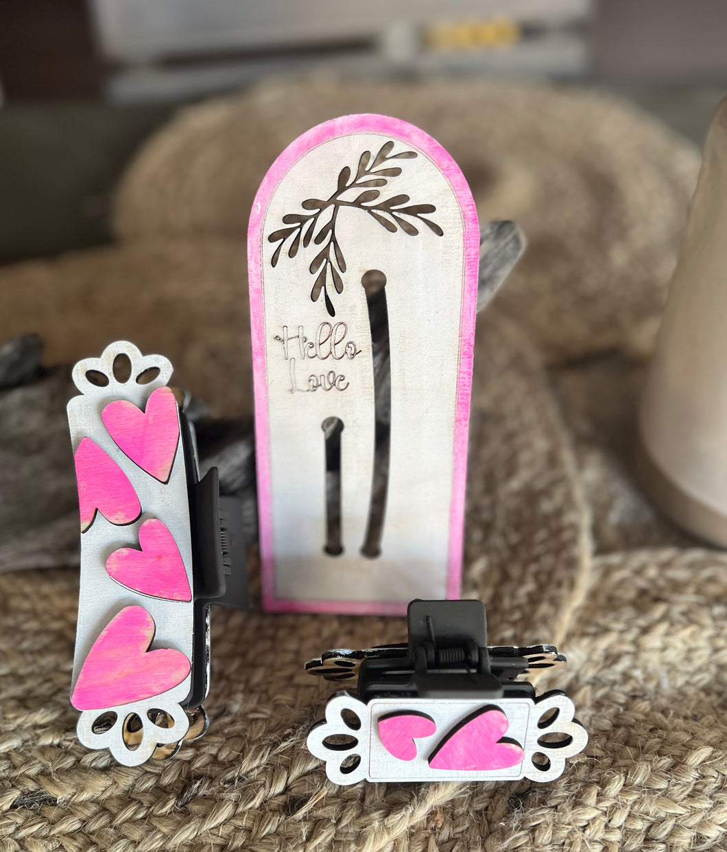 The set includes two hair claws in different sizes, making it perfect for a mama & me pairing or versatile everyday wear. It also comes with an adorable coordinating wooden holder engraved with “Hello Love” and finished with a distressed white background and soft pink border — perfect for display on a vanity or dresser.